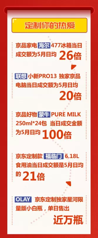 家电品类的定制爆款销量也是直线上升,其中京品家电海尔477冰箱当日成交额为5月日均26倍,小天鹅水魔方成交额为5月日均30倍。京东联合品牌推出的定制民生好物也迎来较快增长,6月1日,蒙牛纯牛奶250ml*24包成交额为5月日均的100倍,京东定制款福临门6.18L食用油成交额是5月日均的21倍,OLAY京东定制独家星河限量版小白瓶单日成交近万瓶。维达秒杀定制抽纸,当天成交额破千万;伯纳天纯C2M定制款前1小时卖出8万斤狗粮。美赞臣铂睿1200g C2M定制单品更是10分钟破百万,超越去年6月1日全天。