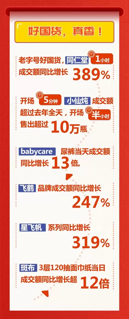 此外,一些口碑与品质兼具的新国品代表也在发光,6月1日当天,斑布BABO BASE系列3层120抽纸成交额同比增长近13倍;babycare尿裤类目当天成交额同比增长超13倍。同时,中华老字号海天品牌当日销量同比增长超300%;国民老字号品牌三元、光明同比增长280%,其中光明纯牛奶250mL*24盒同比增长268% 。