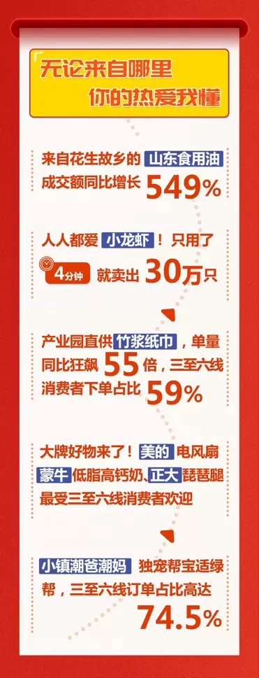 6月1日超级秒杀日,来自花生故乡的山东食用油,成交额同比去年增长超5倍,环比前7日日均增长近7倍;产业园直供竹浆纸巾,单量同比狂飙55倍,其中三至六线城市消费者下单占比59%。小龙虾品类更是战绩喜人,当天4分钟卖出30万只小龙虾。