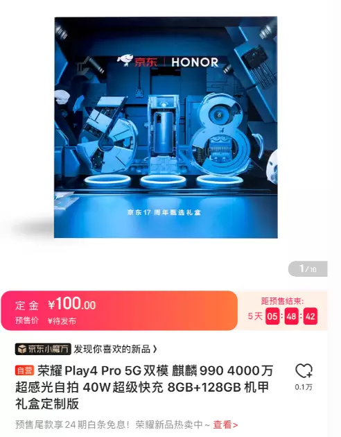 眼下,又有一款全新的5G手机面世:6月3日,荣耀在线上召开新品发布会,正式发布荣耀Play4系列5G手机。这款手机集结麒麟990旗舰芯片、40W超级快充技术、6400万像素四摄像头以及红外测温等功能,让玩家“爽”到飞起。而京东再一次成为荣耀新品的首发平台,荣耀Play4现已经登陆京东618,预售价1799元起。