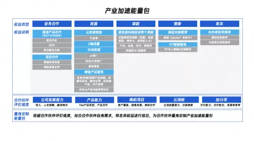 此次能量包涵盖业务合作、资源、课程、管家、资本五大权益,能够为合作伙伴带来包括项目推进、云资源补贴、高层进修、1V1服务、内外部投资推荐等在内的多项服务。从战略到落地全方位加速企业成长,从而共同助力产业转型升级。