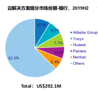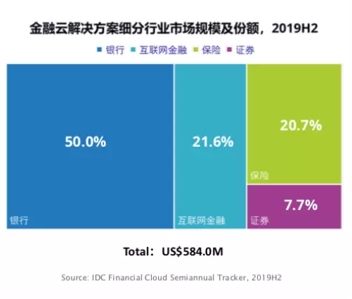 5月中旬,国际权威数据公司IDC最新发布的《中国金融云市场(2019下半年)跟踪》报告(以下简称“报告”)显示,2019年中国金融云市场规模达到33.4亿美元,同比增长49.6%,其中,下半年金融云解决方案市场增速更快,达55.3%。相较而言,整个金融云市场中银行业市场份额占比高达50%,是占比最大的细分市场。