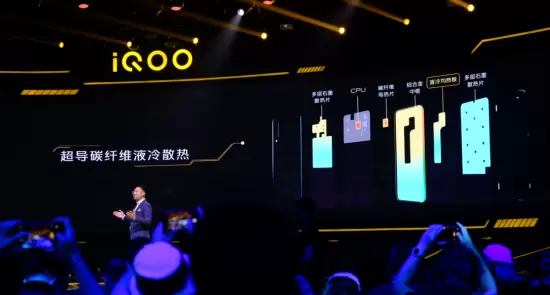 1、散热方面,2019年初APEX的发布会,我们公布了均热板技术,比传统的热管散热能力更强。在iQOO Pro 5G里,均热板技术,而且我们还配合了一种导电效率更高的碳纤维全新界面材料,作用于 5G的Modem和CPU附近来进一步提升导热效率。导热效率是传统硅胶或者冷凝胶的10倍以上。在CPU重载的情况下,能够实时温度更低的性能体现,在5G终端来讲比较领先。