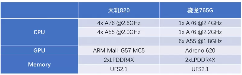 首先看规格对比,天玑820采用了旗舰级的多大核CPU架构,包括4个主频高达2.6GHz的Cortex-A76大核和4个主频2.0GHz的Cortex-A55小核,这是首个引入四个高频大核设计的中高端5G芯片,以往4大核设计都用于旗舰级的手机芯片,采用这种多大核CPU架构设计自然会带来强大的多线程、多任务处理性能。我们先用跑分验证一下。