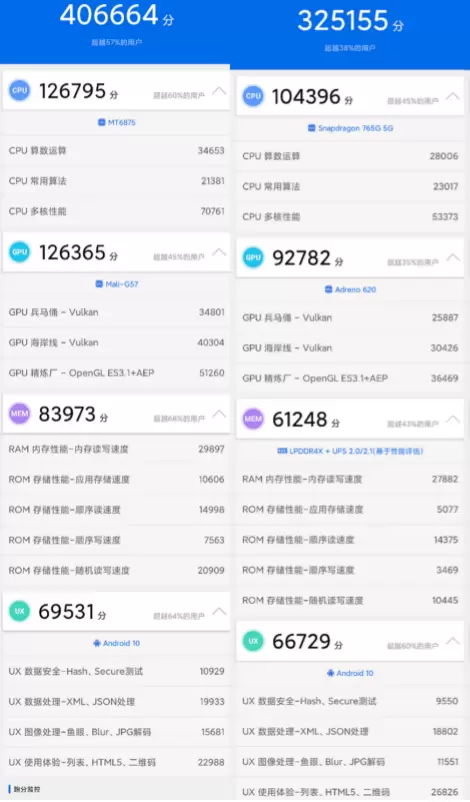 安兔兔跑分:搭载天玑820的Redmi 10X (左)成绩远超骁龙765G终端(右)