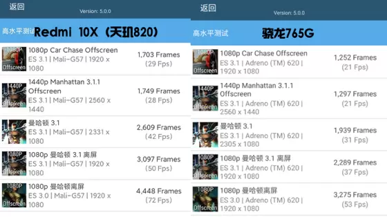 GFXBench测试结果:搭载天玑820的Redmi 10X 的1080p曼哈顿离屏高达72Fps(左)