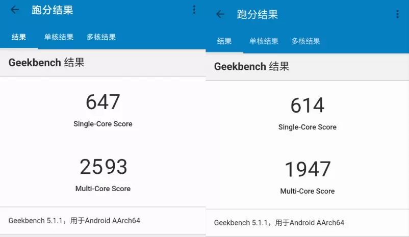 GeekBench得分:天玑820(左)多核成绩完全碾压骁龙765G(右)
