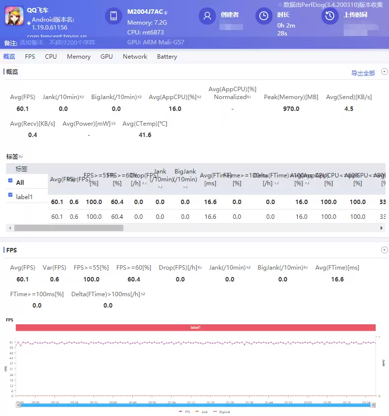 QQ飞车:搭载天玑820的Redmi 10X游戏帧率图