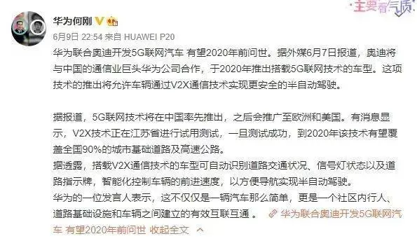 刚刚,华为终端手机产品线总裁何刚在微博全文转发媒体报道,内容是,华为联合奥迪开发5G联网汽车,有望2020年前问世。