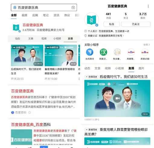 在满足用户抗疫知识需求的同时,百度健康还依托百度搜索大数据优势,洞察用户需求、贴近用户生活,提供针对性强、时效性快的抗疫知识普及服务。近期,百度健康陆续推出“无烟日”13场科普直播、六一儿童健康专场直播等知识分享活动,尤其是在“爱眼日”期间,百度健康推出护眼系列活动,邀知名主持人李静、眼科医生陶勇做客直播间,更有30余位眼科专家通过百度健康直播间开启关注全民眼健康10小时直播接力活动,同时为广大用户提供问医生眼科免费义诊服务。