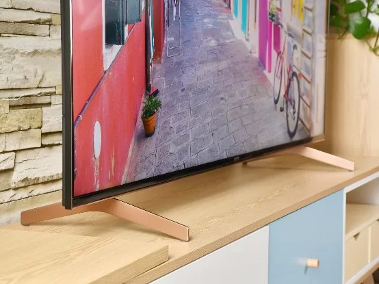 索尼X9100H采用同色系琥珀金底座设计,并在设计上兼容了纤薄与稳固,在保持电视摆放稳定性的同时,令整块屏幕如同悬浮在空中,打造“悬浮屏”的观感。