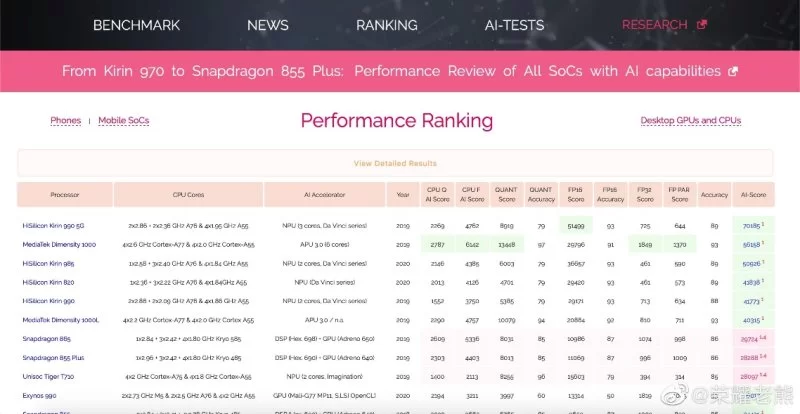 拥有旗舰级硬件配置的同时,麒麟985有着强大的AI能力。麒麟985采用自研架构双核NPU,使用3D Cube技术进行矩阵计算加速,单位功耗下大幅提升AI能力,并带来更优能耗。得益于此,麒麟985在全球AI分数中排名第三,有着先进高效的算法,为相机、日常使用体验等方面带来提升。