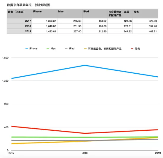 其中一个有意思的变化是,苹果在去年的年报中,开始更加强调可穿戴设备。此前财年年报中的“Other Products”变成了“Wearables, Home and Accessories”(可穿戴设备、家居和配件产品),这一类别表现抢眼,营收244.82亿美元。同比2018年增长41%。具体数据如下图: