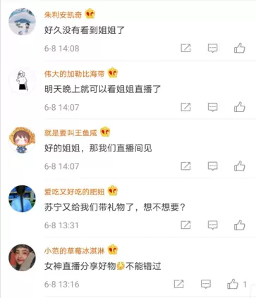 得知女神开播众多粉丝纷纷准备板凳坐等开播,“会和姐夫互动吗?”、“等姐姐剧透《乘风破浪的姐姐》开播日期”、“好久没用看到姐姐了”、“女神直播分享好物不能错过”。