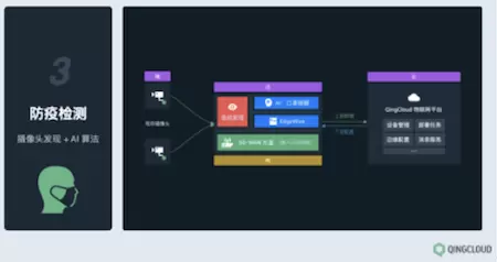 网边的结合还可以在防疫检测过程中发挥重大作用,SD-WAN能够解决网络接入的问题,打通内网和外网,同时限定内网哪些摄像头可以做上层业务判定。再通过EdgeWize视频驱动,自动探测当前网内摄像头,实现摄像头注册,加上AI算法,实现场景应用,与物联网平台衔接起来。疫情期间,青云QingCloud内部就利用这套体系打造了公司内部的防疫检测系统,并且为人脸识别、人脸打卡、会议室预订提供了更多应用扩展上的可能。