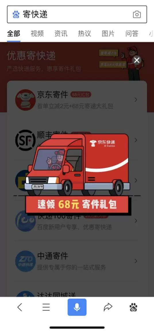 为满足广大毕业生的离校寄件需求,百度智能小程序还与京东快递独家合作,针对高校毕业生推出寄快递有优惠、免费送编织袋的活动。只需扫描编织袋上的二维码或者打开百度APP搜索“寄快递”,点击彩蛋进入即可领取68元的寄件大礼包,轻松寄件,省心省钱。