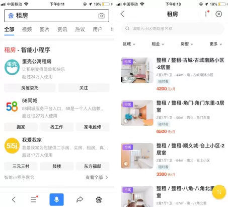 例如,当在百度App上搜索“租房”时,搜索结果首页即会弹出包含蛋壳公寓租房、58同城以及我爱我家等可满足用户租房需求的智能小程序聚合页,点击相应智能小程序就可以查看到附近的相关房源,同时一步到位完成VR看房、线下预约看房等深层需求。此外,智能小程序聚合页上还提供了“搬家”“家电维修”等多元化服务项,为用户提供一站式的搬家租房解决方案。