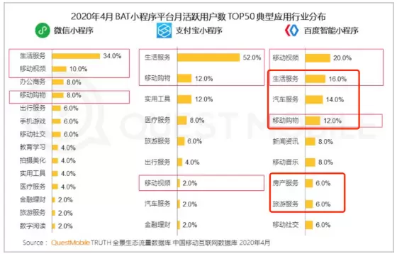 寄快递、租房搬家之外,搜索需求中还蕴含了大量其他本地生活服务类需求。第三方机构QuestMobile最新发布的《2020移动互联网全景生态报告》也显示,BAT纷纷通过小程序载体渗透本地生活服务市场。报告显示,百度智能小程序平台活跃用户数TOP 50典型行业中,生活服务、汽车服务、移动购物、房产服务、旅游服务等本地生活服务相关的应用占比达到54%。