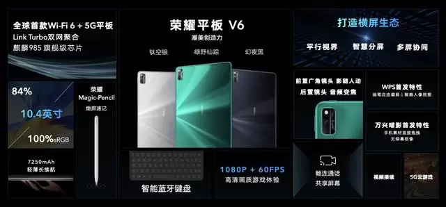 从硬件方面来讲,荣耀平板V6是全球首款同时支持5G和Wi-Fi6的平板电脑。无论出门在外还是在室内或者高铁等移动办公等场景,用户可以实现随时随地上网,从网络上解放了平板的创造力;麒麟985旗舰级芯片的使用,则提升了荣耀平板V6的整体性能,各项表现更加卓越。