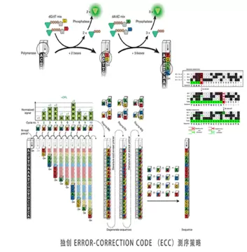 赛纳生物基于NGS测序原理以及信息通讯领域的“编码校验”概念,研发了新的高精度测序方法。其采用对ACGT四种碱基进行正交组合测序以产生简并序列,获得的序列具有自校验功能,测序完成后,利用高准确度的纠错解码算法,可自动检测到在测序过程中发生的痕量测序错误并予以纠正,从而在保证读长的同时极大提高准确度。