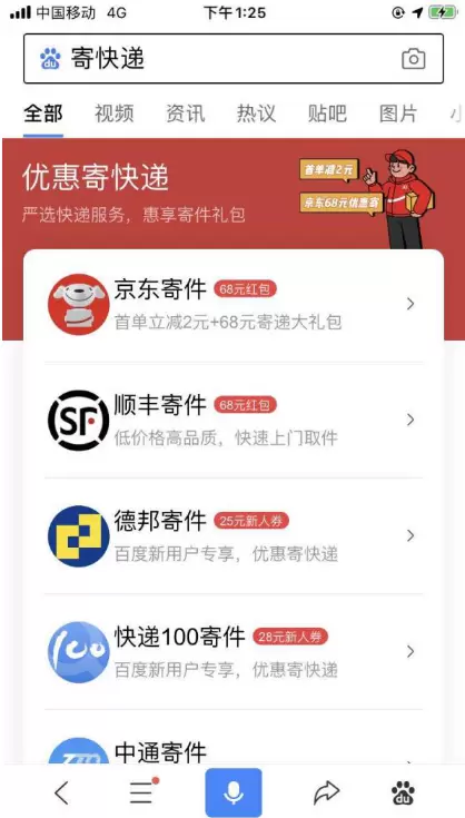 除了马上到来的618,为了满足广大毕业生的离校寄件需求,百度还与京东快递独家合作,针对高校毕业生推出寄快递有优惠、免费送编织袋等活动。用户只需扫描编织袋上的二维码或者打开百度App搜索“寄快递”,即可领取68元的寄件大礼包,轻松寄件。