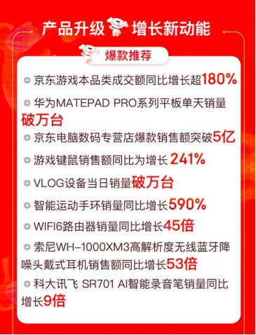 京东618电脑数码品类日当天,大牌新品和甄选礼盒表现出色,人气爆款也是重磅亮相。6月11日当天,京东电脑数码专营店爆款销售额突破5亿;华为MatePad Pro系列平板单天销量破万台;今年电竞浪潮风靡带动了游戏品类热销,京东游戏本品类成交额同比增长超180%,游戏键鼠成交销售额同比为增长241%;直播热潮和vlog时代的到来推动vlog设备大卖,当日销量即破10000台;智能手环正在成为注重运动健康消费者的日常标配,品类日当天智能手环销量同比猛增590%。