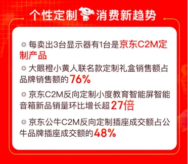 当90后年轻群体逐渐走到消费市场中央,大众化批量生产的普通产品已经无法虏获他们的用户心智,更具有个性的产品和体验逐渐成为用户的消费需求。正是在这种个性化消费观念的驱动下,京东电脑数码为消费者个性化量身定做的C2M反向定制产品备受消费者欢迎。根据电脑数码品类日战报显示,6月11日当天,每卖出3台显示器就有1台来自京东C2M反向定制产品,而在6月1日首发的大眼橙小黄人联名款定制礼盒凭借高萌颜值和专业护眼能力迅速走红,其销售额在品牌销售额中占比高达76%。另外,京东C2M反向定制小度教育智能屏智能音箱新品销量环比增长超27倍,京东公牛C2M反向定制插座成交额占公牛品牌插座成交额的48%。