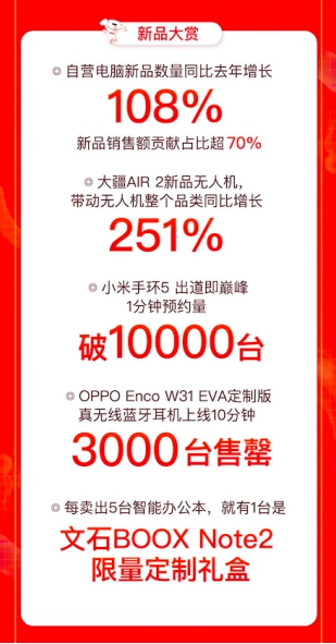 6月11日电脑数码品类日当天,京东自营电脑新品数量同比去年增长108%,新品销售额贡献占比超过70%;小米手环5更是出道即巅峰,1分钟预约量破万台;而引领航拍风潮的大疆Air 2新品无人机,带动无人机整个品类同比增长251%。另外, OPPO Enco W31 EVA定制版真无线蓝牙耳机上线10分钟即3000台售罄; 每卖出5台智能办公本,就有1台是 文石BOOX Note2 限量定制礼盒。