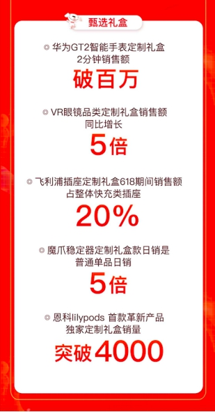 相较于以往备受消费者青睐的电脑数码单品,今年京东618电脑数码会场推出的各类甄选礼盒迎来火爆开场。根据京东电脑数码品类日战报显示,华为GT2智能手表定制礼盒2分钟销售额破百万,VR眼镜品类定制礼盒销售额同比增长5倍。此外,飞利浦插座定制礼盒在618期间销售额占整体快充类插座20%,魔爪稳定器定制礼盒款日销是普通单品日销5倍,恩科lilypods 首款革新产品独家定制礼盒销量也成功突破4000台。
