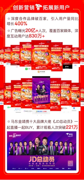 一直以来,京东致力于加强线上线下融合,通过引入多元流量和创新的营销方式,带动线上店铺和线下门店实现获客增收。在6月11日电脑数码品类日当天,与京东电脑数码实现商业化深度合作的品牌已经突破百家,会场引入用户数量同比增长400%,广告曝光20亿+人次,覆盖百家媒体,深度互动用户达830万+,而斜杠马东和先锋喜剧演员金靖携手华为、联想等十位品牌大佬开启硬核直播带货模式,《JD总动员》带大家一起直播一起Buy,截至6月11日,节目累计观看人次已经突破221万,可以说是创新营销案例的成功典范。