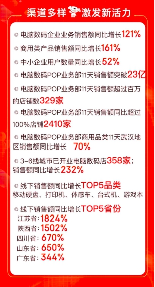 京东618线上火热,尽显主场风范,线下也是火力全开,助力第三方商家、商用渠道和京东电脑数码专卖店线下店全渠道激发消费新活力。电脑数码品类日当天,企业业务和商用类产品销售额分别同比增长121%和161%,中小企业用户数量同比增长52% 。而在6月1日-11日期间,京东电脑数码第三方商家成交金额突破23亿,成交金额超过百万的店铺329家,成交金额同比超过100%的店铺2410家。其中,武汉地区商用品类11天累计成交金额比去年同期增长70%,逆势增长的亮眼战绩正在释放一个信号——广大用户的消费活力已被重新激活,消费市场正在跑出复苏加速度。
