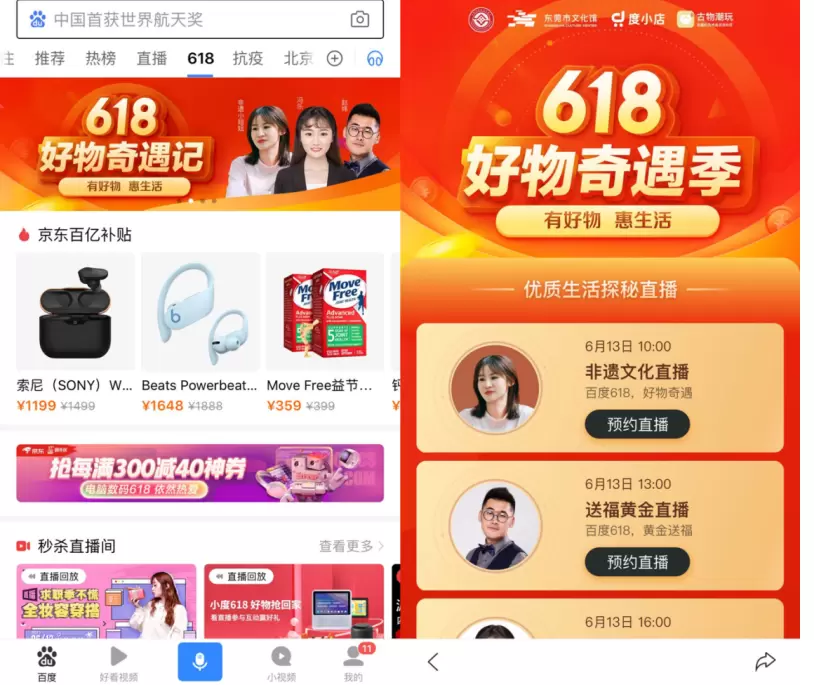 除了联手京东做内容带货,618频道上另一部分内容集中在百度自身的直播带货上。通过“好物奇遇记”和“秒杀直播间”端口进入后,可以看到“风土人情”、“生活好物”、“小度商城”、“古玩潮物”等几十场直播及直播预告。从直播内容上,与目前淘宝、抖音、快手等直播内容形成了比较鲜明的差异性。这也是百度一直对外强调的,打造泛知识直播带货属性。
