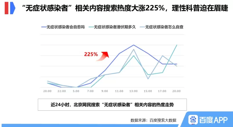 此次新增病例多与“无症状感染者”有关,这也令北京市民对“无症状感染者”的关注度再次攀升。百度搜索大数据显示,北京网民搜索“无症状感染者会自愈吗”“无症状感染者潜伏期多久”“无症状感染者怎么自查”等相关内容的热度整体激增225%,相关知识的理性科普仍需加强。