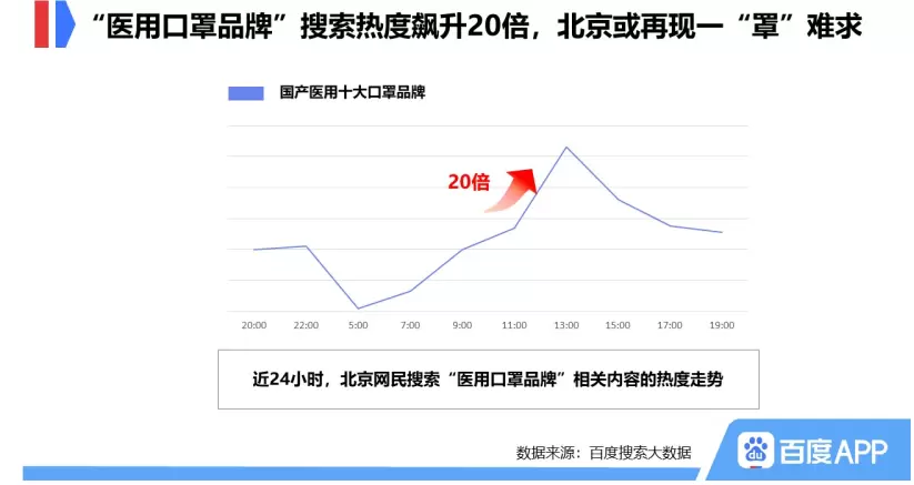 值得一提的是,北京网民搜索“医用口罩品牌”相关内容的热度也在近24小时内飙升20倍,如何保障生产生活秩序的平稳运行、确保防疫物资的有效供给,成为北京市民关注的一大重点。