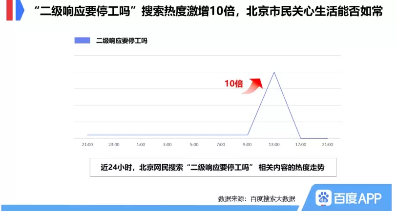 发布会上,北京市丰台区代区长初军威表示,丰台区将按照“三级响应、二级管控”要求应对;海淀区也同日宣布所有社区全部恢复二级响应防控措施;此前也有消息称北京市餐饮业防控重回二级应急响应状态。应急响应状态调整之下,北京市民对工作生活能否如常也迫切关心。百度搜索大数据显示,近24小时北京网民搜索“二级响应要停工吗”相关内容的热度上涨超10倍。
