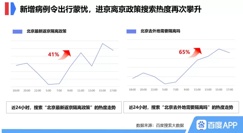 由于新增确诊病例的发现时间距离端午假期不到两周,这也引发了人们对于进京离京、隔离政策等事项的担忧。百度搜索大数据显示,“北京最新返京隔离政策”的搜索热度在近24小时内上涨41%,“北京去外地需要隔离吗”搜索热度则上涨65%,相关离京进京政策有待尽快明晰。