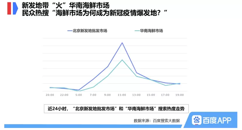 巧合的是这与疫情最初集中爆发地之一的华南海鲜市场有着相似性。百度搜索大数据显示,近24小时内“北京新发地批发市场”和“华南海鲜市场”的搜索热度均大幅提升,且热度走势一致,“海鲜市场为何成为新冠疫情爆发地”等问题也受到大众关注。