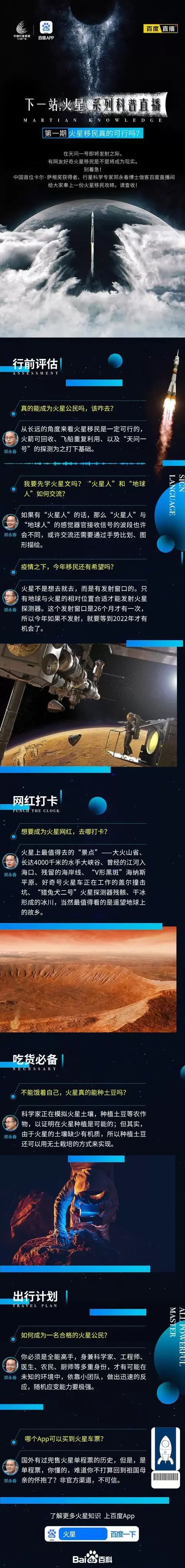 火星移民是否可行?火星上都有哪些“网红景点”?在“天问一号”即将发射之际,中国火星探测工程和百度App联合打造的“下一站,火星”系列科普直播,第一期为大家奉上一份火星移民攻略,信息量超多,请戳长图了解。想了解更多火星小知识,记得打开百度App搜索“火星”,你想知道的全都有哦!