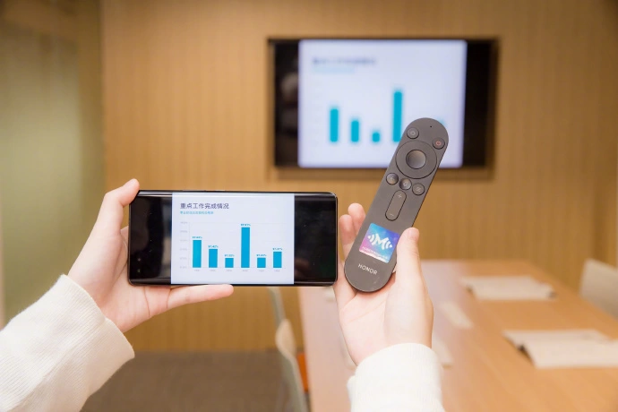 在会议内容分享方面,荣耀智慧屏PRO本身还拥有Magic-Link魔法闪投这样便捷的投屏功能,无需下载任何App,只要将手机与随机附赠的NFC贴片轻轻一碰,手机上的会议文件、图片或视频就可以2秒投屏至智慧屏,极速完成会议分享。结合荣耀智慧屏PRO智能家居控制和YOYO语音助手,体验间内的路由器、灯等智能设备还可通过智慧屏控制,让用户感受更加智慧的办公氛围。