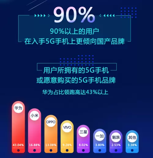调查显示,90%以上的用户已入手的5G手机均为国产品牌,其中华为占比43.04%,小米占16.88%,OPPO、VIVO分别占13.08%和9.28%,以及魅族的2.53%,一加的3.80%,其中三星占比8.02%。