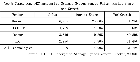 IDC:2020Q1浪潮存储出货量居中国前三、增速第一