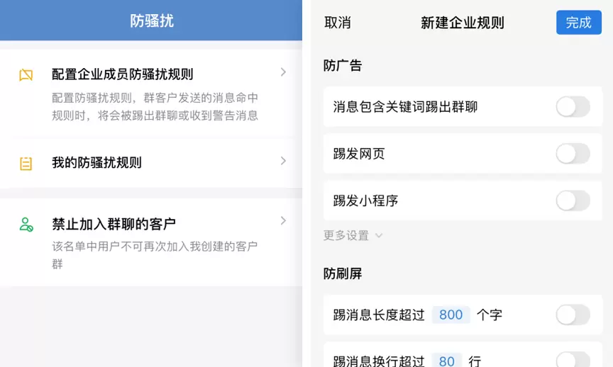 在3.0.24版本中,企业可为客户群开启防骚扰,将发广告、刷屏的群客户自动移出群聊,并设为禁止入群的客户。