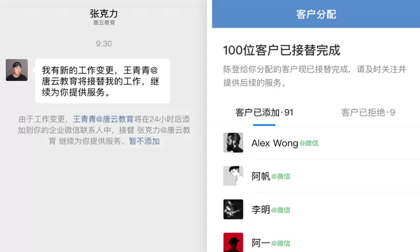 在3.0.24版本中,企业微信离职继承进一步优化,离职继承不再需要客户手动确认,客户将在24小时后自动添加新接替的成员。相对于之前需要客户手动确认是否愿意切换新的企业联系人的方式,新版本免去了客户手动确认的步骤,降低了客户对员工离职的感知,能大大降低客户的流失率。