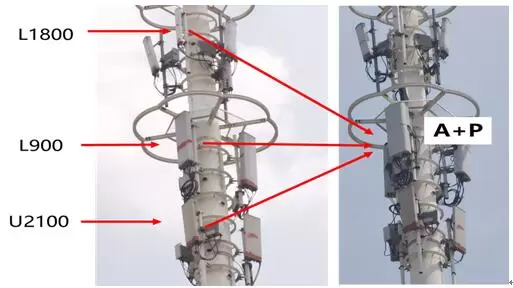 A+P设备能同时支持2/3/4/5G全频段,无需新增抱杆,施工通过一体化安装方式吊装操作,直接替换原4G天线并开通5G,大幅缩减施工周期,降低建设成本。改造前该管塔联通L1800设备安装在第一层、L900 4G设备安装在第二层,U2100 3G设备在第三层,已经没有空间安装5G设备。采用A+P设备改造后将三套天面设备整合到一起,保证了5G覆盖效果同时减少了2副天面设备。