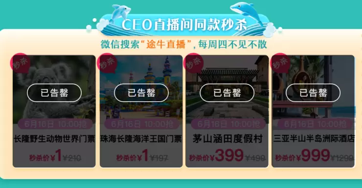 各类秒杀优惠中,CEO直播间同款的优惠力度最大、人气最高,长隆野生动物世界门票和珠海长隆海洋王国门票以低至1元的价格参与秒杀,茅山涵田度假村399元、三亚半山半岛洲际酒店999元……“白菜价”的热门酒景使用户喜不自胜,6月16日上午10点,秒杀产品上架后瞬间售罄。