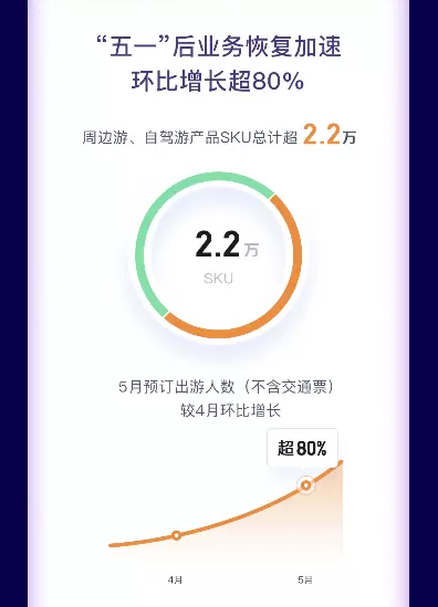 自3月中旬,多省市文旅主管部门陆续发布恢复旅游企业部分经营活动的通知,周边游率先“一键重启”,截至5月,途牛上线的周边游、自驾游产品数量总计超过2.2万,5月预订出游人数较4月环比增长超80%。