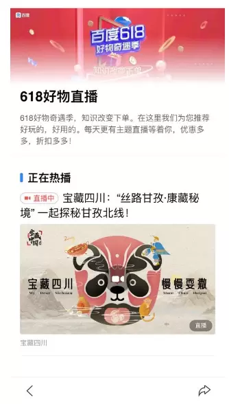 一方面,百度已开发出丰富的直播场景。2020年以来,百度直播先后推出“战疫直播间”、医疗专家科普直播、“水下有什么”直播、“师傅请赐教”系列直播、“专治不开心八点档”、民法典科普直播、宝藏湖北慢直播等,覆盖人们日常生活、学习、娱乐等全场景。同时,在618期间,百度还策划了“行走的文明”、“宝藏四川”以及宝宝知道、好物奇遇记等多场直播。