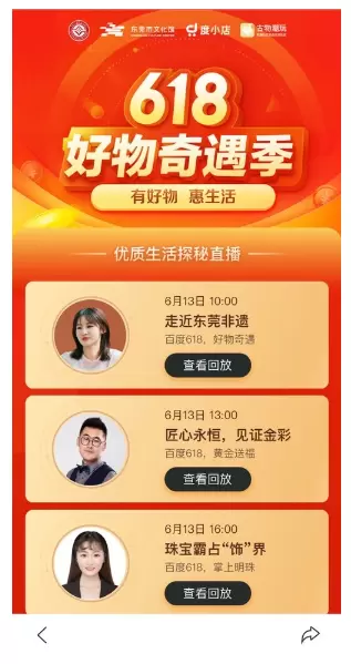 例如,在618频道的“秒杀直播间”子频道中,百度直播在6月13日推出的618好物奇遇记之壹仟俩黄金专场,带领全国网友走进深圳金明丰珠宝有限公司,深入黄金研发与生产车间,还原“一根金条的诞生”。直播过程中,金明丰相关负责人向网友介绍了丰富的黄金知识,吸引了近230万人次观看。同时,配合秒杀抢购、超值补贴、厂价直供等空前的优惠力度开展直播带货,带动了大量网友在直播过程中下单购买。