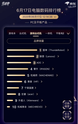 6月18日零点的钟声即将敲响,京东618年中大促也进入了最后的冲刺时刻,电脑数码会场内各大品牌厂商齐秀家珍、你方唱罢我登场,各品类高性价好物上演极致数码盛宴。其中,台式机作为个人电脑的起点,随着电子竞技的发展不断更新,也再度成为了新的消费热点,国产经典品牌雷神更是一举夺得游戏台式机品类品牌销售榜榜首,再续佳绩。