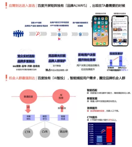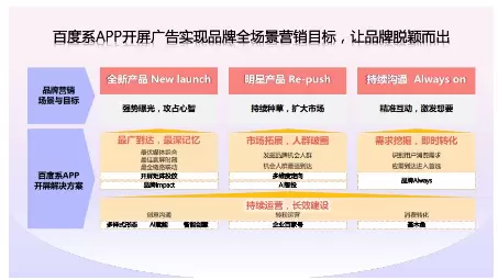 百度营销中心发布的报告显示,百度开屏矩阵在『全新产品New launch』的营销场景下,为品牌客户提供『最佳媒体组合』、『最佳霸屏时刻』、『最全链路联动』,来解决品牌强势曝光、最深记忆的营销目标。在『持续沟通 Always on』的营销场景下。品牌ALWAYS功能借助搜索、浏览、出行等不同场景下的数据,能够完成对受众实时意图的预测,并根据相应结果联动搜索、品专、开屏和信息流等不同形式完成全链路多场景的多重曝光加持。数据显示,这一升级版的定向技术能够帮助品牌客户实现高达30%的点击率提升。在『明星产品Re-push』的营销场景下,百度独有的“AI智投”将人工智能技术储备赋能于广告投放领域,能够在AI的助力下快速挖掘有高转化可能的目标人群。
